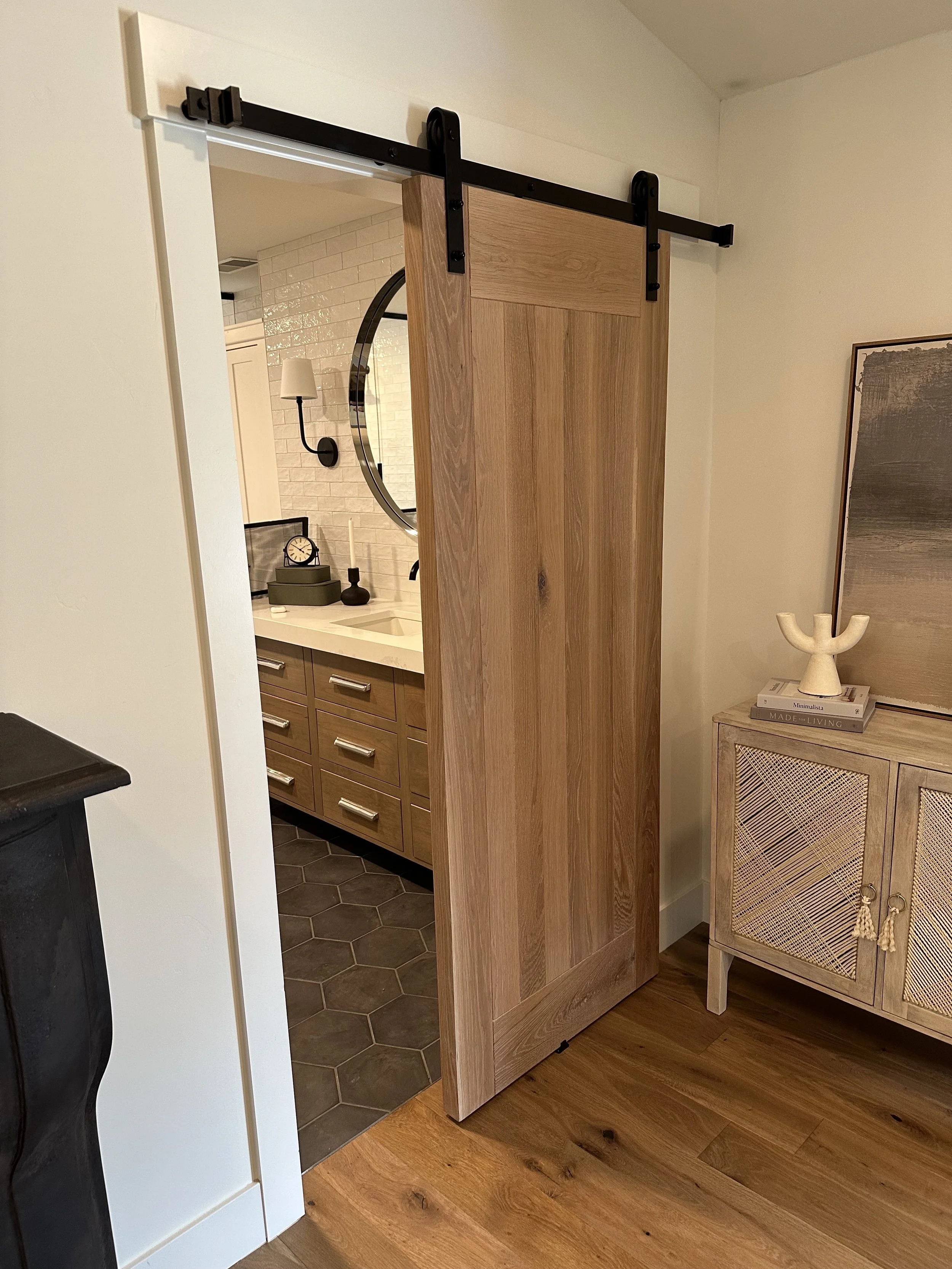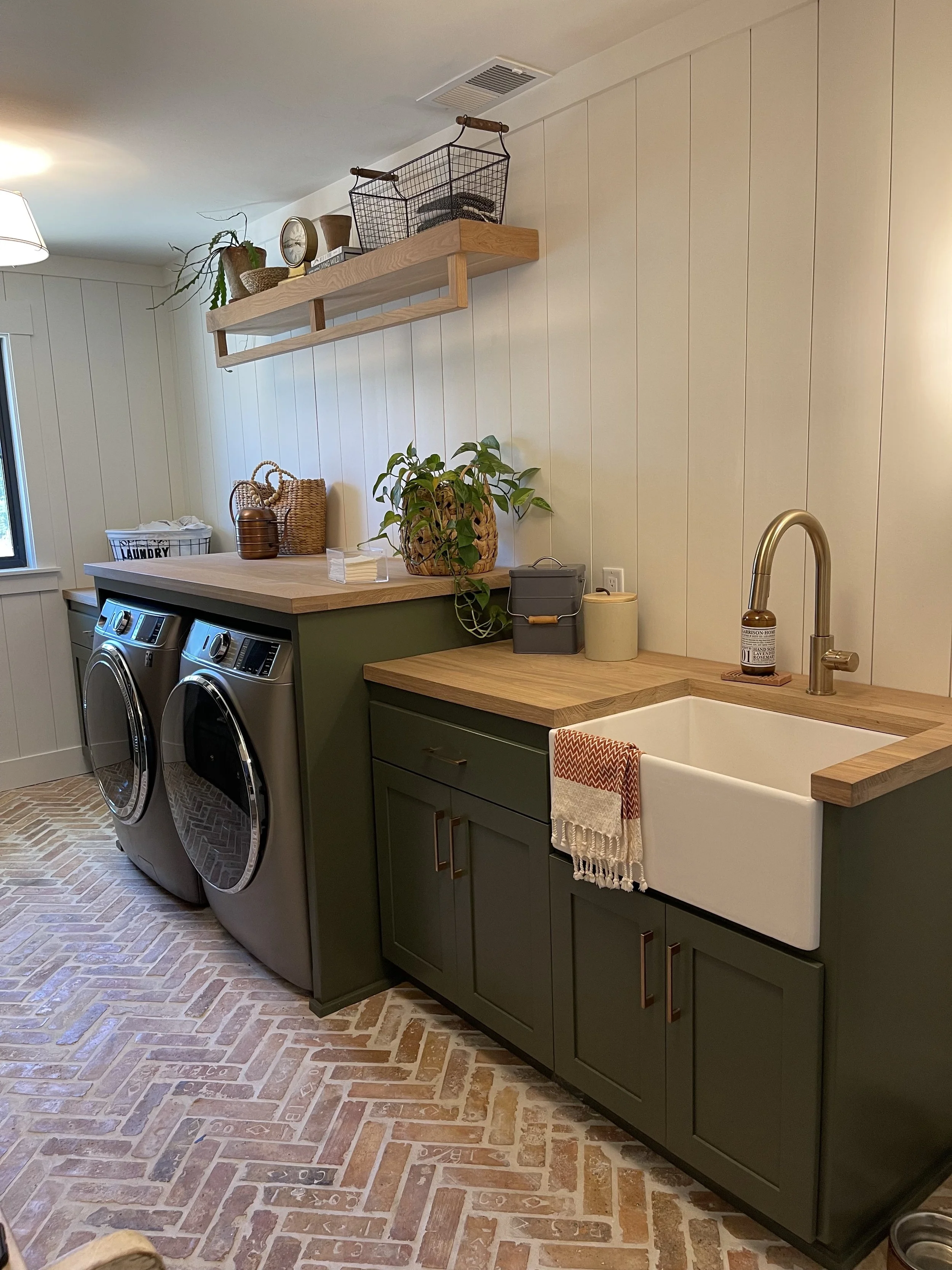 Wide plank custom counter tops + Floating shelf with built in hanger rod - White Oak