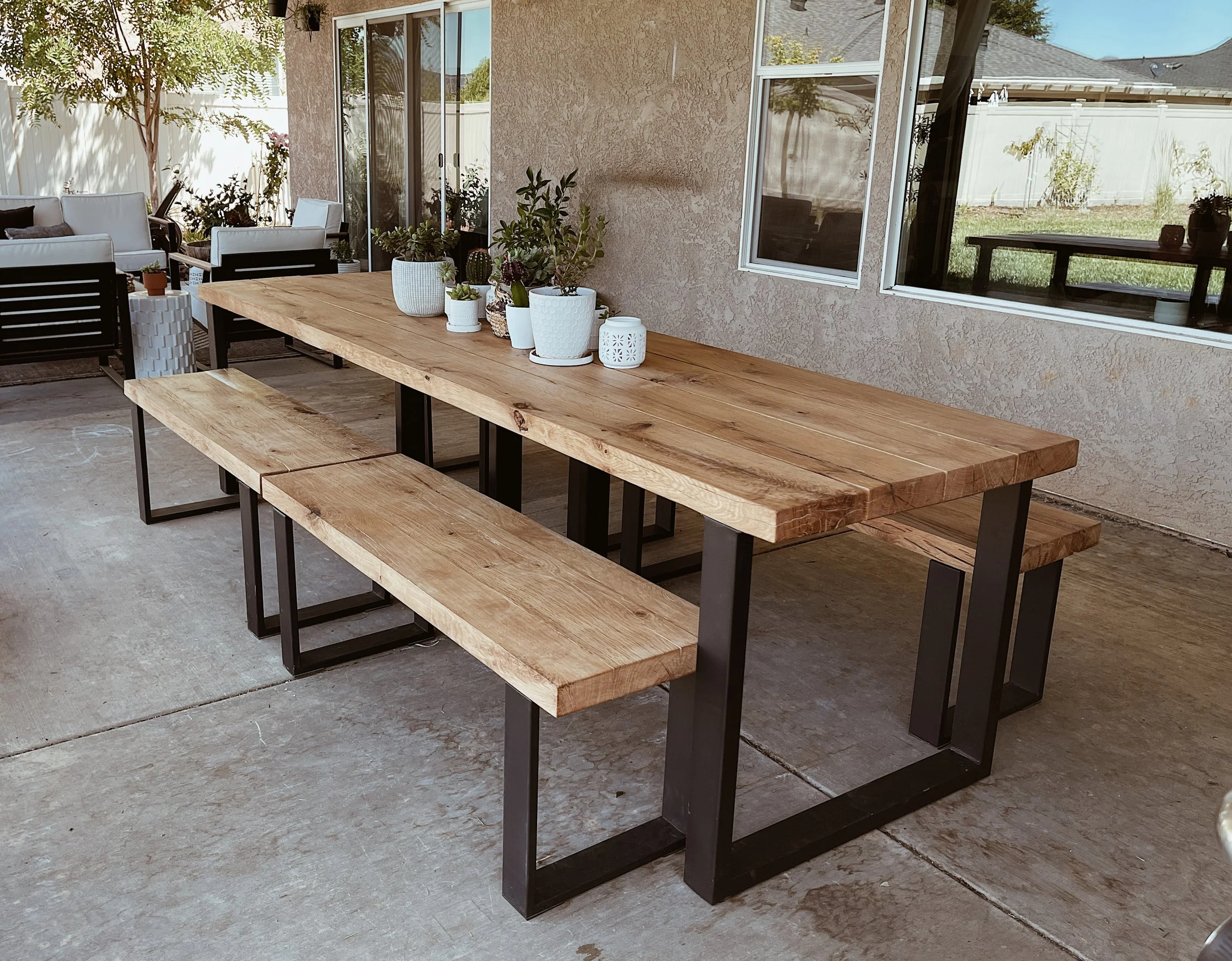 Outdoor Dinning table with black steel legs + four matching benches - White Oak